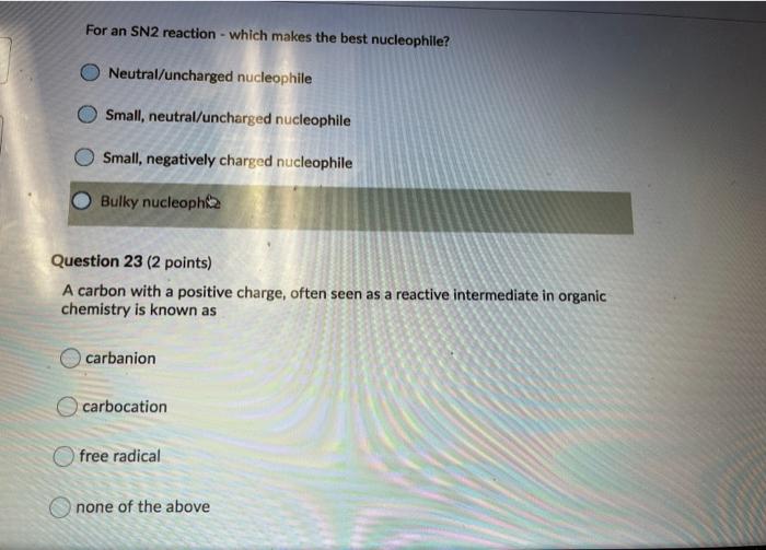 Besides does E2 favor a strong base. It is assumed that the nucleophile attacks the carbon atom attached to the halogen atom from the side opposite to the halogen ie. Neutraluncharged nucleophile Small neutraluncharged nucleophile Small negatively charged nucleophile Bulky nucleopha Question 23 2 points A carbon with a positive charge often seen as a reactive intermediate in organic chemistry is known as carbanion carbocation free radical none of the above.